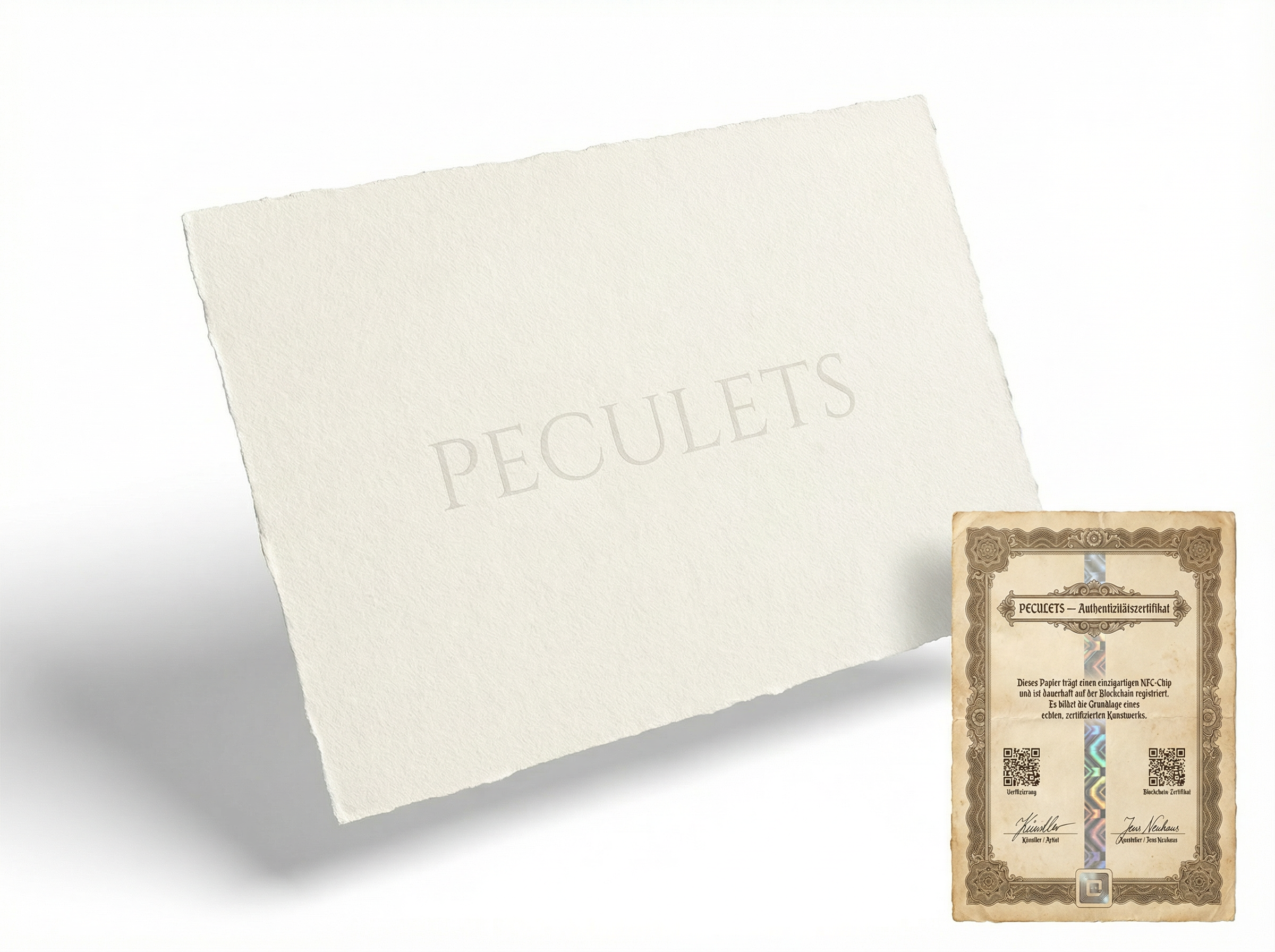 Jedes Peculets-Kunstwerk existiert in zwei Formen: als physisches Original und als digitales Zertifikat auf der Blockchain. Beide können nur gemeinsam den Besitzer wechseln.