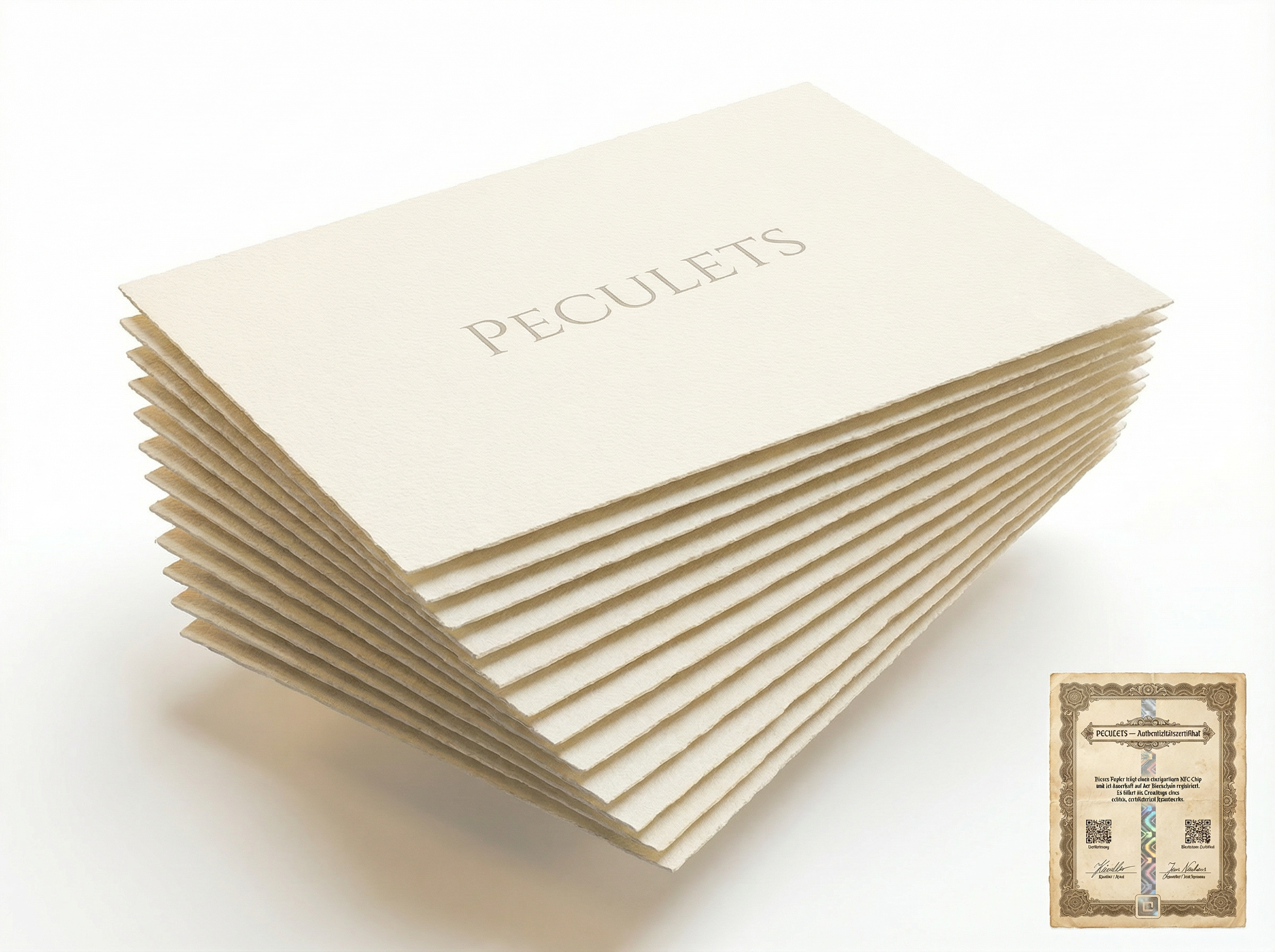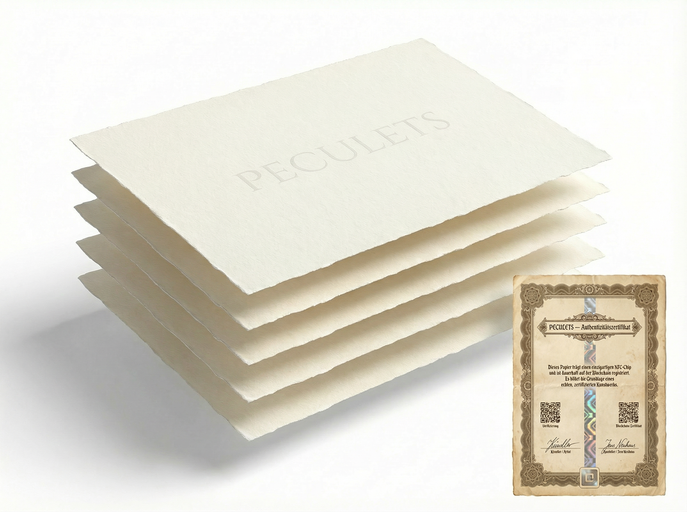 Echtes Aquarellpapier, handgefertigt, mit integriertem NFC-Chip. Greifbar, einzigartig, unveränderlich.