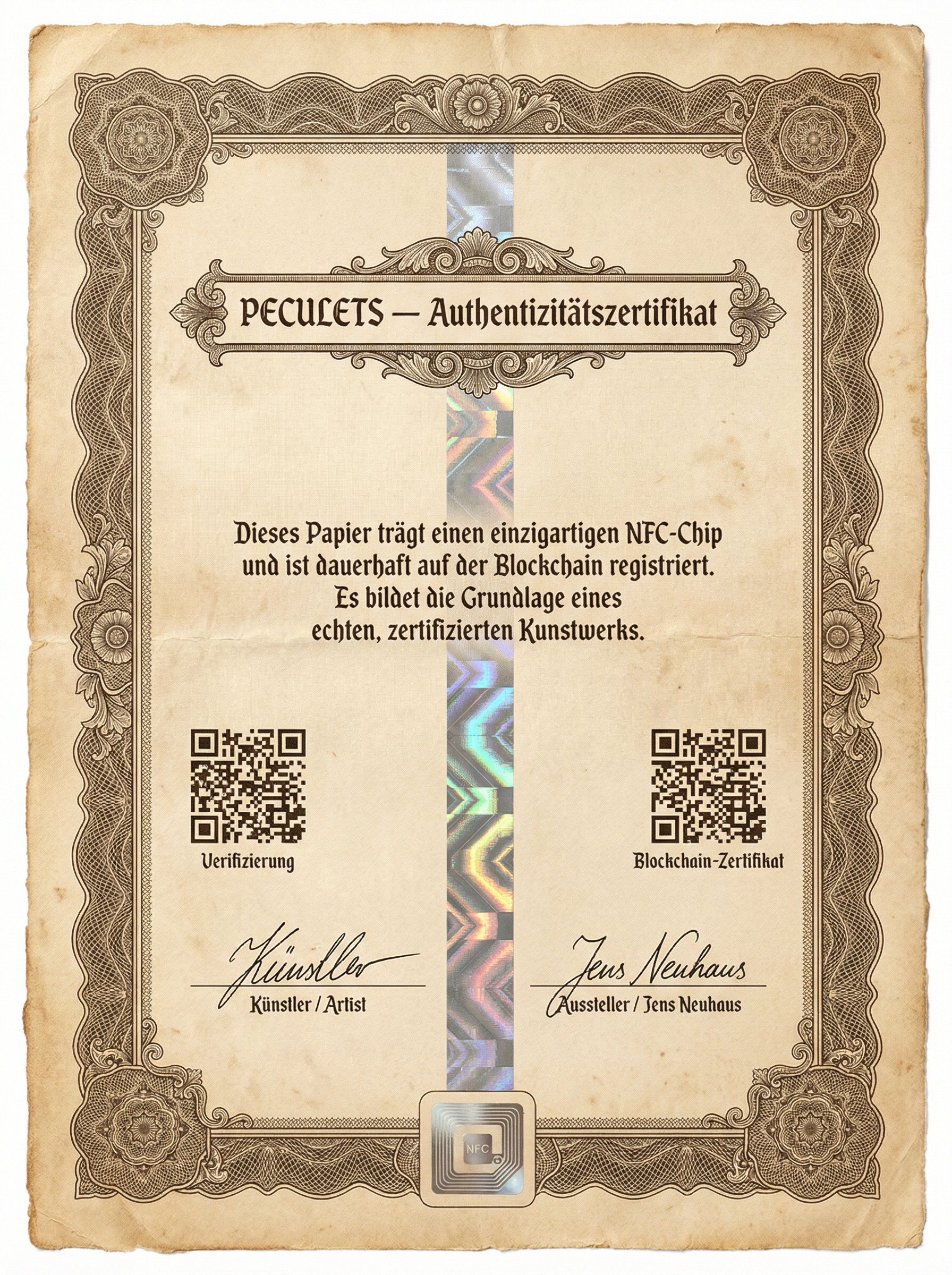 1 Bogen Peculets Sicherheitspapier mit eingebettetem NFC-Chip. Jeder Bogen ist einmalig registriert und bildet die Grundlage für Ihr blockchain-zertifiziertes Kunstwerk.